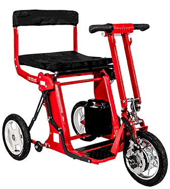 Das Modell Di Blasi R30 ist ein faltbares Dreirad mit einem modernen Elektromotor. Es ist der optimale Wegbegleiter für Personen, welche aus gesundheitlichen oder persönlichen Gründen kein Fahrrad mehr fahren können, aber trotzdem mobil bleiben möchten. Die meisten Elektrorollstühle sind klobig und schwer, sodass man diese nicht transportieren kann. Der Di Blasi Faltrollstuhl ist aber das Gegenteil, denn er ist klein und leicht. Im gefalteten Zustand hat der Scooter die Größe eines Koffers. Sie müssen einfach nur eine Taste betätigen und das Mobil entfaltet sich von ganz allein. Wenn das Gefährt durch den beeindruckenden Faltmechanismus entfaltet ist, bietet es einen einfachen tiefen Einstieg zum bequemen Sitz. Nach dem Einschalten braucht man nur den Drehgriff zu betätigen, um die Geschwindigkeit zu regulieren. Es kann zwischen zwei Geschwindigkeitsstufen gewechselt werden. Der leistungsstarke Motor von 250 Watt und das relativ geringe Eigengewicht ermöglicht sogar Steigungen von bis zu 11 % zu befahren. Die Gesamtbreite ist nur 62 cm und der Wenderadius beträgt 82 cm. Somit ist das Dreirad auch in engeren Bereichen fahrbar. Auch das Rückwärtsfahren mit zusätzlichem Warnton ist möglich. Zusammengeklappt hat der Di Blasi R30 Scooter die Größe von nur 62 x 39 x 48 cm und kann daher fast überall gelagert werden: z.B. im Kofferraum, im Reisemobil oder in der Wohnung. Wenn das Mobil zusammengefaltet ist, kann man es durch den herausziehbaren Griff wie einen Rollkoffer hinter sich herziehen. Das Gewicht (inklusive Akku) beträgt 25,45 kg und ohne Batterie, die schnell entfernt werden kann, beträgt das Gewicht 22,7 kg. Das Modell R30 wird mit einer modernen Lithium-Batterie betrieben, welche sehr leicht und zuverlässig ist. Die Anwendung des Akkus erfordert keine besondere Pflege, dank eines elektronischen Steuergerätes für Ladung und Entladung. Die aktuelle Akkukapazität lässt sich auf einer Anzeige ablesen und bei eintretender Dunkelheit schaltet sich sensorgesteuert die LED-Lichtanlage automatsch ein. Mit einer Akkuladung ist eine Gesamtstrecke von bis zu 35 km möglich.